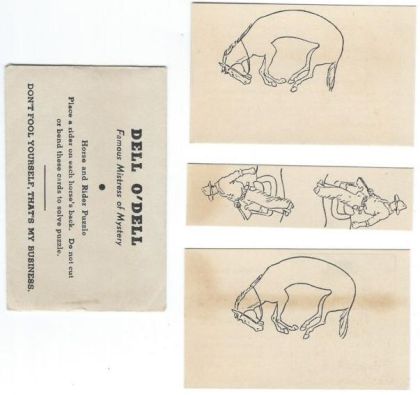 This is the "Put the two riders on the two horses" puzzle, originally developed by Sam Loyd. On the back of one of the horse cards is a photo of Dell O'Dell. The other card has a laudatory quote about her peformance in a Night Club, by Bruno Lessing, a New York City columnist. Lessing died in 1940 so this is probably from the late 1930s.