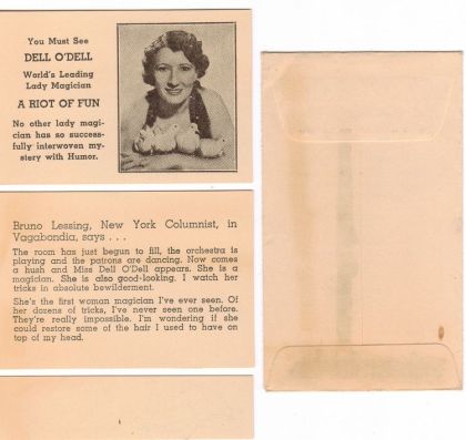 Dell O'Dell was the stage name of Nell Newton (20 Oct 1902 - 5 Feb 1962) an American magician regarded in her profession as a pioneer who provided a role model for modern female performers and noted for being one of the first magicians to appear on television. At the height of her career she was billed as "The World's Leading Lady Magician" and "The Queen of Magic."[1]