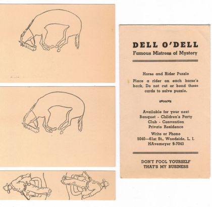 This is the "Put the two riders on the two horses" puzzle, originally developed by Sam Loyd. On the back of one of the horse cards is a photo of Dell O'Dell. The other card has a laudatory quote about her peformance in a Night Club, by Bruno Lessing, a New York City columnist. Lessing died in 1940 so this is probably from the late 1930s.
