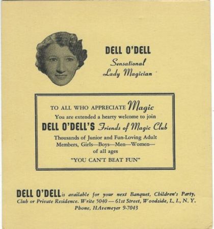 Dell O'Dell was the stage name of Nell Newton (20 Oct 1902 - 5 Feb 1962) an American magician regarded in her profession as a pioneer who provided a role model for modern female performers and noted for being one of the first magicians to appear on television. At the height of her career she was billed as "The World's Leading Lady Magician" and "The Queen of Magic."[1]