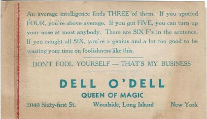 Dell O'Dell was the stage name of Nell Newton (20 Oct 1902 - 5 Feb 1962) an American magician regarded in her profession as a pioneer who provided a role model for modern female performers and noted for being one of the first magicians to appear on television. At the height of her career she was billed as "The World's Leading Lady Magician" and "The Queen of Magic."[1]