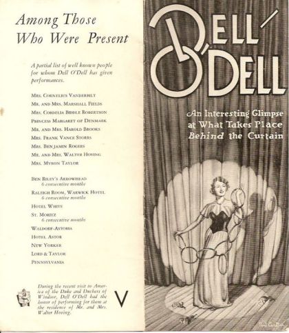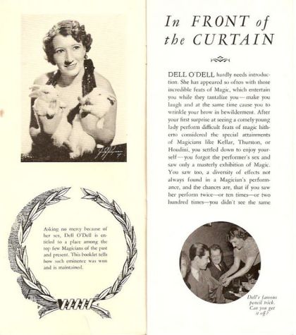 Tall, narrow booklet for noted Woman Magician Dell O'Dell. Drawing of her on cover, performing the linking rings, was done by artist Paul Carlton. Titel above image: "DELL O'DELL An Interesting Glimpse at What Takes Place Behind the Curtain". Filled with photos of her performing, standing in her apparatus room, practicing, sewing-making-painting props, feeding her animals, etc. Back page is filled with a notable list of places and people for which she has performed.