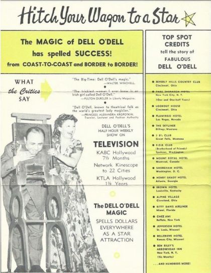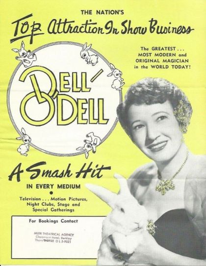 Woman Magician Dell O'Dell printed promotional flyer, circa 1950s. Her photo on front holding one of her rabbits. Reverse side has photo of her performing the head chipper. Laudatory comment reprints are from Walter Winchell, and Fulton Ourssler. Right side lists hotels and other sites where he has performed.