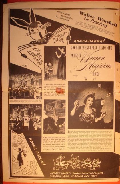 Dell O'Dell-Large format publicity brochure of 8 pages, circa 1950s, worn but complete. She has many action photos of many of the places where she performed. Also included are reprints of large photo articles from Good Housekeeping, Spot Magazine, NY Sunday Mirror Newspaper Magazine Section, Earl Wilson Column from the NY Post Newspaper, and Liberty Magazine. Also laudatory comments from Walter Winchell, Fulton Oursler, and others. One of the largest of her publicity items. Of interest is the last photo. Bottom half shows her performing the Doll House illusion at a night club in Greenwich Village. The photo just above this has Roland Travers, in the background. Text identifies him by name as her assistant.