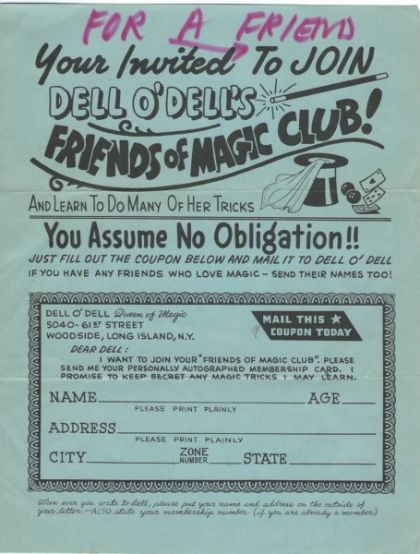 Dell O'Dell-Large format publicity brochure of 8 pages, circa 1950s, worn but complete. She has many action photos of many of the places where she performed. Also included are reprints of large photo articles from Good Housekeeping, Spot Magazine, NY Sunday Mirror Newspaper Magazine Section, Earl Wilson Column from the NY Post Newspaper, and Liberty Magazine. Also laudatory comments from Walter Winchell, Fulton Oursler, and others. One of the largest of her publicity items. Of interest is the last photo. Bottom half shows her performing the Doll House illusion at a night club in Greenwich Village. The photo just above this has Roland Travers, in the background. Text identifies him by name as her assistant.