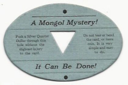 A small cardboard oval with a small tri-angular hole in the center. It is called, "A MONGOL MYSTERY ... IT CAN BE DONE!". You have to push a Silver Quarter through the small hole without bending or tearing the card. Back of card has rubber stamped lines:
