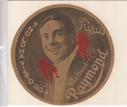 It is a round (approximately five inches in diameter) piece, printed in two colors on newsprint-type paper. It was apparently used as an ad which was glued on walls and in stores. Often two of the pieces were adhered on opposite sides of round cardboard and strung under a circular fan in theaters. The wind from the fan would make it spin with Raymond showing on both sides, or used as a CIRCULAR LUGGAGE STICKER. This item is from the 1920's
