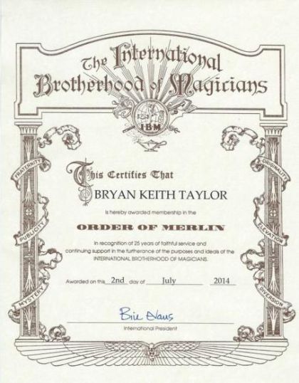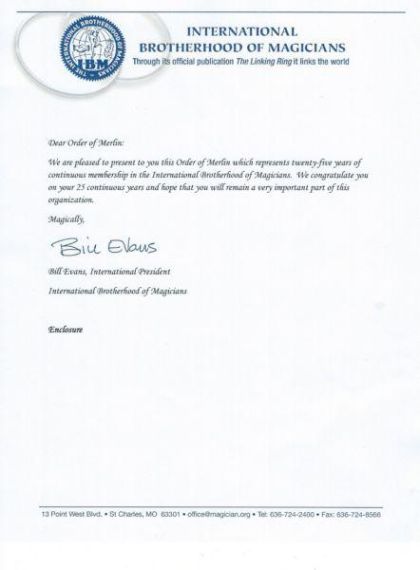 The International Brotherhood Of Magicians 25 year Certificate
