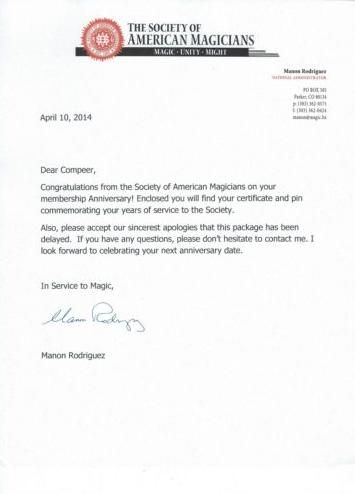 The Society of American Magicians 25 year Certificate