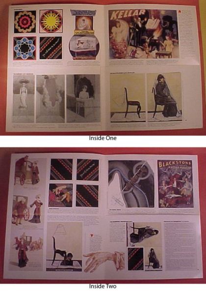 Open it one way and you see Talma tricking a cab driver, explanations of DeKolta's vanishing lady and The Greek Horse, a Blackstone poster, and two tricks to do. One is a mind reading trick. The other is a diminishing card. Open it the other way and you find a Kellar poster, explanation of two sideshow illusions, Thauma and the Living Mermaid, continuation of explanation of DeKolta's vanishing lady, Explanation of a Cremation Illusion with mirrors, and the backs of the mind reading cards.