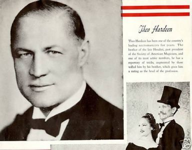 One of the acts was Theo Hardeen the brother of Harry Houdini. Next to Hardeen’s photo was this text: Theo Hardeen has been one of the country’s leading neo cromancers (sic) for years. The brother of the late Houdini, past president of the Society of American Magicians, and one of its most active members, he has a repertory of tricks, augmented by those willed him by his brother, which gives him a rating as head of the profession.