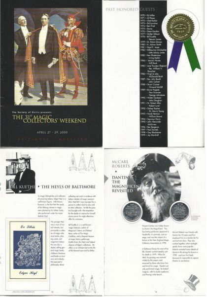 This is the colorful and detailed program booklet for the Magic Collectors' Weekend, that took place in 2000, in Baltimore, Maryland. The Society of Osiris was the sponsoring organization. Filled with images of speakers, their subjects, shows, etc. . The amazing part is that they included inserts attached to some of the pages. The corporate seal of the Society of Osiris is on the Past Honored Guests page. The bookplate of Edgar Heyl is on page for Bill Kuethe's talk on The Heyls of Baltimore, and two aluminum Dantini magic tokens are on the page for McCarl Roberts talk, Dantini The Magnificent Revisited. One token appears to be MT-098 from the Kuethe book. This other appears to be a variant. Tokens are pasted down to the page. Text on the variant reverse is: "1978 / WORLD / PREMIER / WILLIAM / DONALD / SCHAEFER / MAYOR"