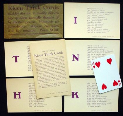 The Kleen Think Cards enables anyone to readily discern any question mentally thought of by another person. Positively no confederacy. Anyone can learn it in five minutes…….!!!!!