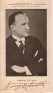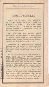 George F. Schulte was a popular Chicago society entertainer and author of professional patter for magicians, who also wrote laugh lines and stage patter for other magicians and entertainers. One of his favorite tricks is the Conradi Coffee and Milk effect which was explained in "Trix and Chatter" (1921). In 1918-19, during the world war, Schulte was a feature attraction with the U. S. Navy Show, "Jacks of All Trades"