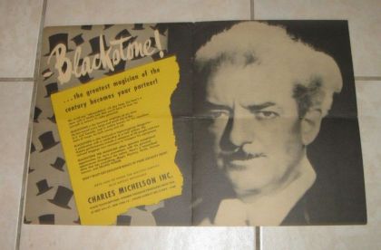 ADVERTISING BLACK MAGIC BROCHORE / MAGIC POSTER SHOWN FEATURING MAGICIAN HARRY BLACKSTONE KNOWN AS THE GREAT BLACKSTONE.IT IS A PROMOTIONAL OFFER TO NCLUDE BLACKSTONE ON YOUR VENUE.IT IS SHOWN FROM BOTH SIDES AND MEASURES 11 INCHES TALL AND 17 INCHES ACROSS.IT COMES IN VERY NICE CONDITION WITH MINIMAL WEAR AND DISPLAYS GREAT.VERY HARD TO COME BY
