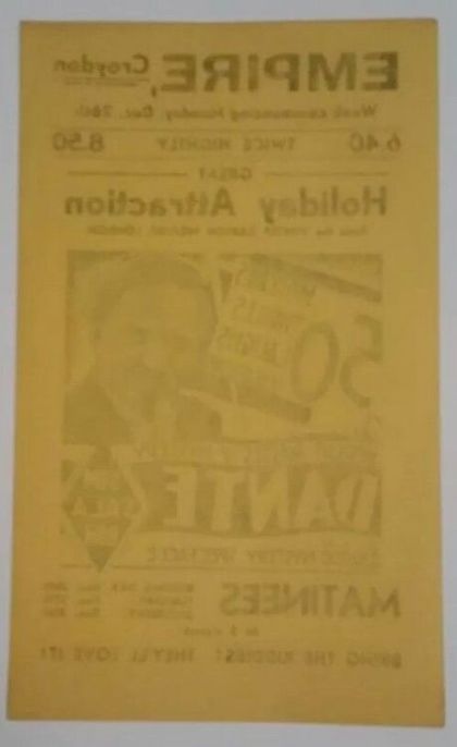 Original black print on yellow paper broadside from Dante's Sim Sala Bim tour. Corners are square if not quite crisp. The broadside shows a little bit of and darkening around the edges but no paper loss and no creases. Printed one side only. Calculated the year using the show dates and an online perpetual calendar. Measures 5 5/8"X9 1/4"