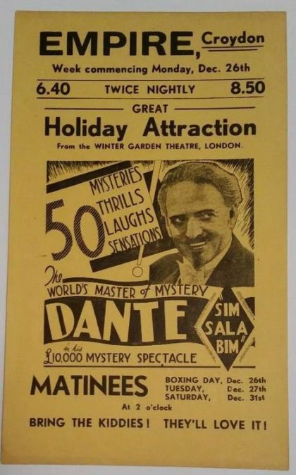Dante toured the world with his show "Sim-Sala-Bim", including on Broadway. Sim Sala Bim was Dante's trademark which he used as his magic words. He was often billed as the "King of Magicians."
