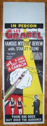 Printed by Central Show Printing inc., Iowa, Circa 1950-55. Signed by Lee Grabel (Just above the see a girl shot from a cannon banner). With starlet Helene. See a girl shot from a cannon.
