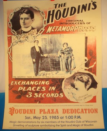 This is a large Houdini Plaza Dedication Poster, from the Sat. May 25, 1985, dedication ceremony for the opening of the Houdini Plaza in Appleton Wisconsin. Image on the poster was taken from the earlier poster used by Houdinit for his Metamorphosis Illusion.