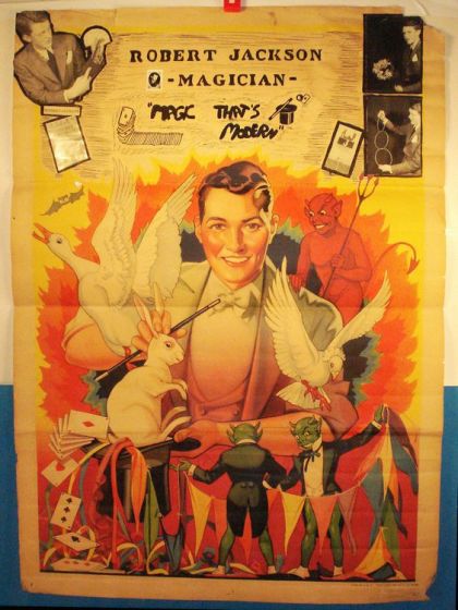 This is a Stock Magic Poster, used by young magician Robert Jackson, circa 1940s/50s. Stock poster was done by the Eire Litho and Printing Company. Color image is of a young magician wtih rabbit, done, goose, and a group green imps. Stenciled on top in the blank ares is "ROBERT JACKSON - MAGICIAN - "MAGIC THAT.S MODERN" ". He pasted photos of himself on the top left and right corners, with spring flowers, linking rings, a fan of cards and an Abbott Wooden silver painted table.