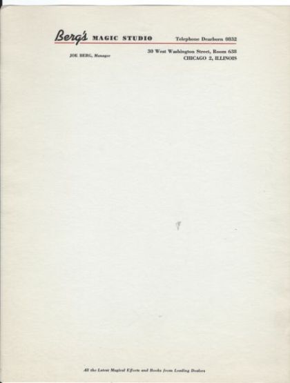 Magic Dealer Letterhead, Joe Berg's Magic Studio 30 West Washington Street, Room 638, Chicago 2, Illinois, circa 1940s/50s.