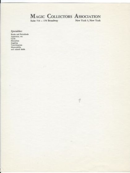 Magic Collectors Association, New York City, with Dr. Young's Address Letterhead