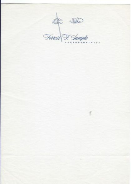 Magician Forrest R. Sample, Legerdemainist, with image of hand holding wand on top. No date.