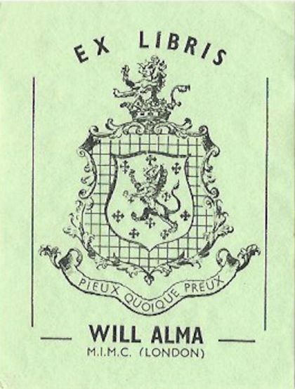 FRONT: Printed on light green paper, a family coat of arms is in the center. Text above and below: " EX LIBRIS / WILL ALMA / M.I.M.C. (LONDON)"