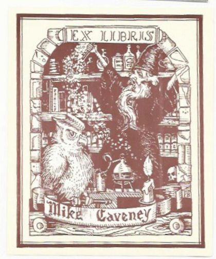 Bookplate for Magician Mike Caveney. Image is of an Owl & Wizard in his laboratory, in brown ink on glossy paper. Top text, "EX LIBRIS". Bottom text, "Mike Caveney".