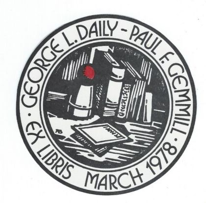 Round Bookplate with text, "George L. Daily-Paul F. Gemmill . Ex Libris March 1978.". Image in center of books and cup, with red ball on top. Daily had more than one bookplate, with some such as this for a specific part of his collection. Paul F. Gemmill was the full name of Paul Fleming.