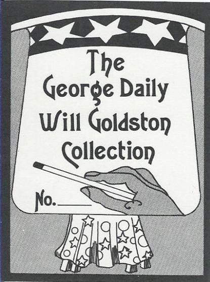 Bookplate with text, "The George Daily Will Goldston Collection No. ___". Image is of a large top hat on a small table, with a hand holding a magic wand. Daily had more than one bookplate, with some such as this for a specific part of his collection.