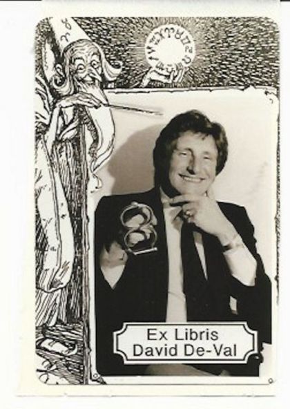 Bookplate for British Magician/Escape Artist David De-Val. Background art shows the wizard with the London Magic Circle logo. His photo on front holding a pair of plug-8 handcuffs. Text on bottom: "Ex Libris / David De-Val". Back has peel-and-stick paper cover still attached. Never used.
