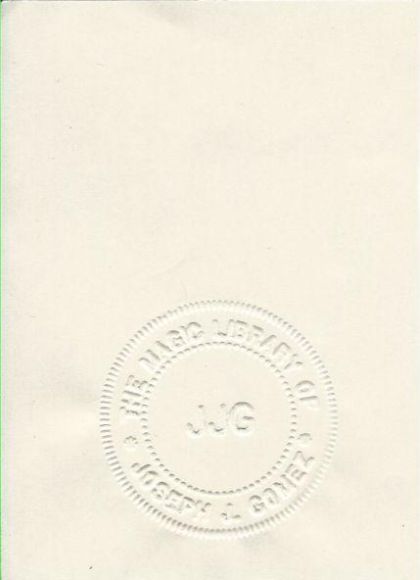 Embossed Bookplate like a notary seal, with text-"THE MAGIC LIBRARY OF JOSEPH J. GOMEZ" around his initials in the center,