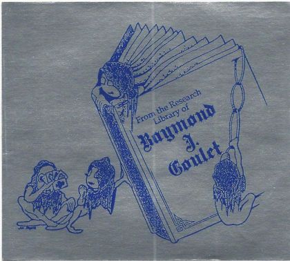 FRONT: Four naked imps sit and play with a large book with title on front: "From the Research Library of Raymond J. Goulet". Printed in blue ink on silver paper.