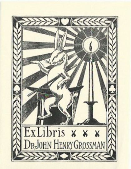 Dr. John Henry Grossman-ca1980s Image in center of a rabbit prancing in front of a Top Hat and lit candle. Tex on bottom: "EX LIBRIS / Dr. John Henry Grossman". Back as wet and stick glue, never used.