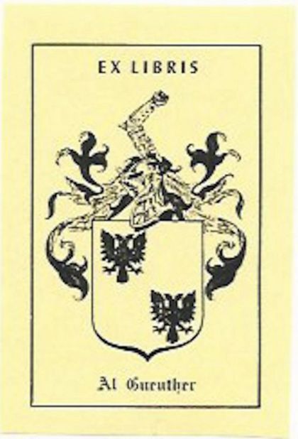 Bookplate for Magician and Magic Collector Al Guenther, date unknown, possibly circa 2000. Front has coat of arms, with two double headed eagles on shield, with knight's armor headpiece and arm above the shield. All printed in black ink on light tan paper. Back is blank, has never been used.
