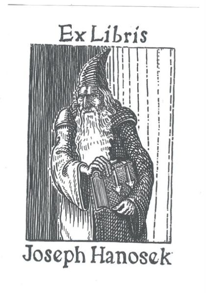Magician Joseph Hanosek. Image of a Wizard holding a book under his arm. "Ex Libris" above, and "Joseph Hanosek" below.
