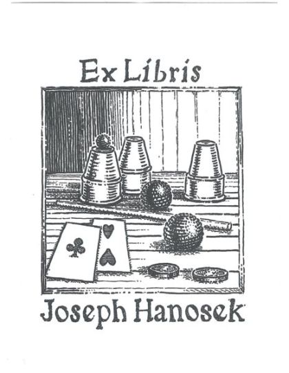 Magician Joseph Hanosek. Image of a Wizard holding a book under his arm. "Ex Libris" above, and "Joseph Hanosek" below.