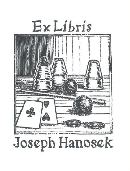 Magician Joseph Hanosek. Image of a Wizard holding a book under his arm. "Ex Libris" above, and "Joseph Hanosek" below.