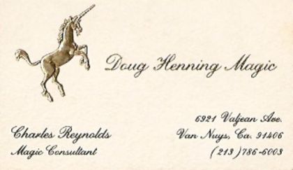 Business card for Doug Henning Magic, in gold ink, with embossed gold unicorn. Address on lower right is in Van Nuys California. Name to lower left: Charles Reynolds Magic Consultant.