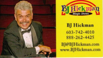 The (your organization)_________________________________ is presenting a performance of magician BJ Hickman on (day/date/time) _______________________________________. Magician BJ Hickman entertains family audiences with comedy magic, dazzling deceptions, and mind reading miracles. Hickman’s audience participation magic shows are a popular favorite throughout New England. He also performs at various nation-wide venues including the famous Magic Castle in Hollywood. Tickets are available at (location/price/details).
