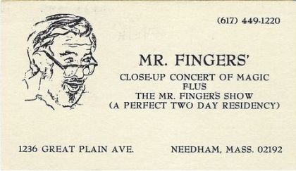 Irv Weiner (1923-1999), also known as John Avery, performed as "Mr. Fingers" and was the owner of Irv Weiner's Studio of Magic.