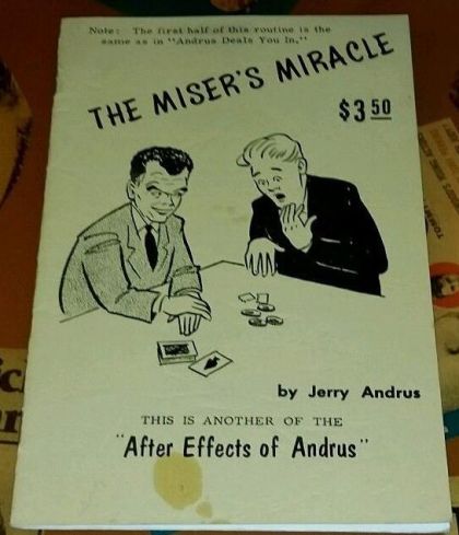 This book is signed by Jerry Andrus called The Miser's Miracle this is another of the "After Effects of Andrus". Book is in great condition with no creases. It does have a spot on the front cover from oil or something.