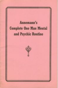 "Anneman's Complete One Man Mental and Psychic Routine" saddle stitched paper cover, 24 pages. Cover is faded on edges, pages are intact, 1 dogeared. price written in pencil on inside. Published by Louis Tannen, New York. 9" x 5 3/4"