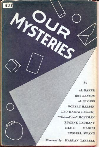 OUR MYSTERIES by Al Baker, Roy Benson, Al Flosso, Robert Harbin, Leo Hartz, 'Think a Drink' Hoffman, Eugene Laurant, Miaco Magini, Russel Swan, illustrated by Harlan Tarbell. Published by Sphinx Publishing Corporation, New York City, 1941. Book is hardback, with a dust jacket, 63 pages, illustrated. Very good condition, please see photo.