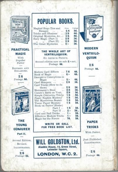 Later, in the November of 1914, he became involved in the merchandising of "magic tricks" as William Goldston Ltd. based in Aladdin House, off Leicester Square, in London.