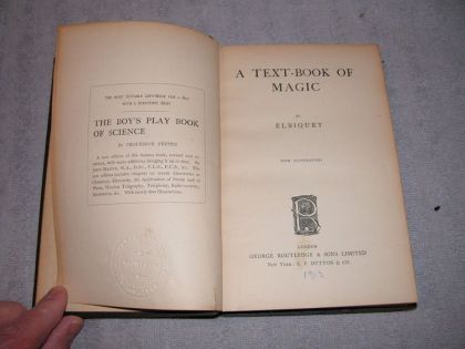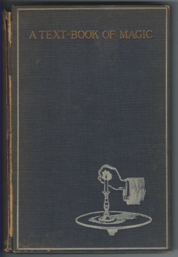 A TEXT-BOOK OF MAGIC by Elbiquet have held up fairly well being 100 old. The pages are browing now with age, but the text is still crisp and the bindings tight, though there are issues with the covers of both books. Has the standard types of tricks, cards, coins, hanks, etc. The condition of the cover is that the corners are bumped and worn. The cloth on the spine is separated all down the front. It is now a flap attached to the back, but can be repaired.