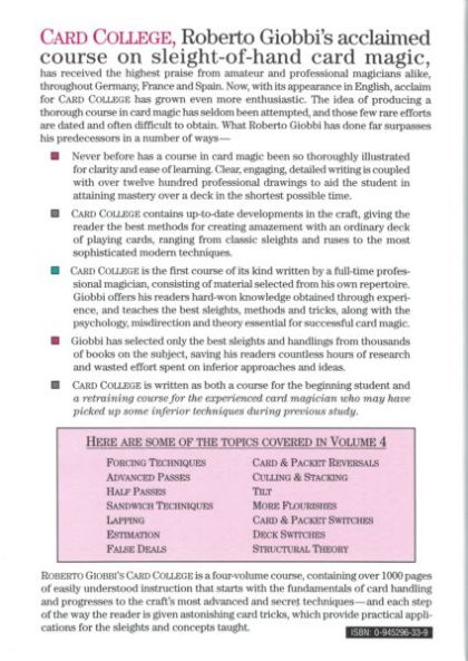 Here are some other topics covered in Volume 4: Forcing Techniques, Card & Packet Reversals, Advanced Passes, Culling & Stacking, Half Passes, Tilt, Sandwich Techniques, More Flourishes, Lapping, Card & Packet Switches, Estimation, Deck Switches, False Deals, Structural Theory. Also included is a full index to the first four volumes.
