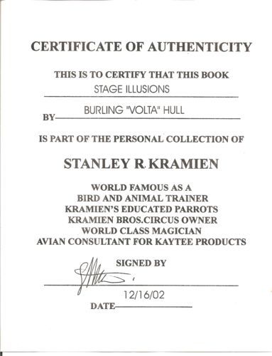 In his final years, Hull lost his eyesight, a loss he never learned to accept. He died at the age of 93 in a nursing home.[1] Hull's life and his impact upon the world of stage magic were described in a 1977 biography, The Edison of Magic and His Incredible Creations, written by Samuel Patrick Smith. Both his Svengali Deck of 1909 and his 33 Rope Ties and Chain Releases, written in 1915, are still popular today. While living in DeLand, the same town as Herbert L Becker, Burling and Becker worked together on illusions for Becker’s tour with Alice Cooper