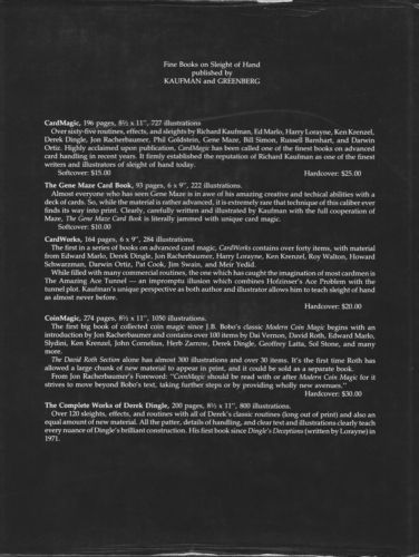 Every nuance of technique, every line of patter, every ingredient that makes Derek's magic so special is captured by Richard Kaufman, on of magic's most innovative writers and illustrators. With over 11,000 words of text and 800 illustrations the very essence of Dingle's magic is clearly taught as never before. Hardbound and Fully Illustrated